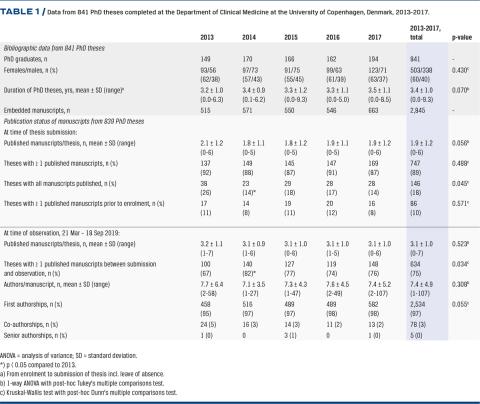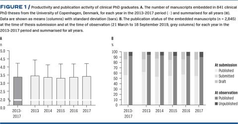 Methods: A total of 841PhD theses from the Department of Clinical Medicine, University of Copenhagen, were concluded in 2013-2017. These theses were examined, and all published manuscripts were identified in online databases. Thesis bibliographics, publication activity and article/journal impact of the published manuscripts were obtained between 21 March and 18 September 2019.