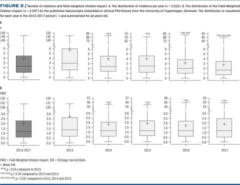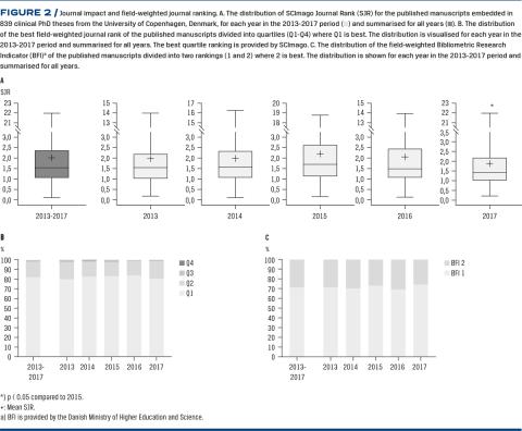 Overall, the present findings suggest that the scientific outcome of clinical PhD theses conducted at the University of Copenhagen was high, as 92% of all manuscripts were published in peer-reviewed journals with a fieldweighted journal ranking and citation impact above the world average. This indicates that the strategic motives behind graduation are not compromising the scientific productivity and quality of the theses.