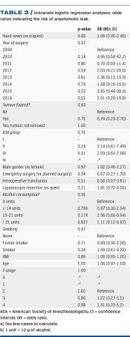 Univariate analyses (including the following covariates: gender, tobacco use, alcohol intake, blood transfusion, ASA group, acute vs elective surgery, laparoscopic versus open surgery, TNM stages and anastomotic technique) failed to identify any significant risk factors for anastomotic leakage (Table 3). Also, as none of the registered variables had a p-value < 0.2, no multivariate analysis could be performed as planned. Instead, to minimise the risk of missed interactions between factors, multivariate logistic regression analyses with combinations of all mentioned co-variates were performed.