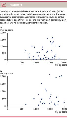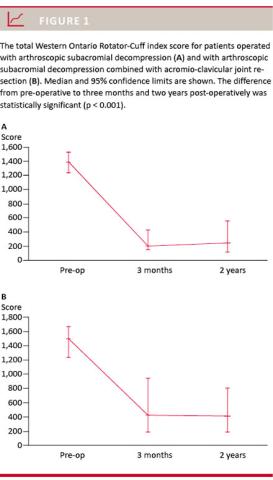 We evaluated the effect of ASD and combined ASD and acromio-clavicular (AC) joint resection (ASD+ACJR) as measured by the WORC index in a series of patients pre-operatively and at three months and two years after the operative procedure. Furthermore, we recorded self-reported restriction in ROM two years post-operatively.