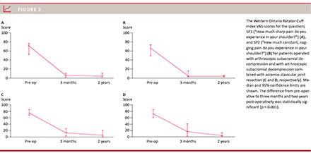 We found a significant improvement in WORC scores at three months and two years after arthroscopic subacromial decompression, and combined arthroscopic subacromial decompression and AC joint resection. However, 13% of the subjects had no better or even worse WORC index scores at the two-year follow-up, and 56% still suffered a ROM restriction at two years post-operatively. Based on our results, we believe that we can inform the patients who comply with our pre-operative definition for impingement syndrome that there is approx. an 80% chance of a noticeable improvement after ASD or ASD+ACJR and a chance of a very good or excellent shoulder status after 45% of the operations. However, a reduction in active ROM may be anticipated in 50-60% of the cases.