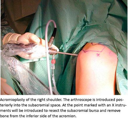 The same experienced shoulder arthroscopist operated all patients. At surgery, a subacromial bursectomy, an acromioplasty and a transection of the coracoacromial ligament was performed through a posterior and a lateral approach. If an ACJR was included, this was done through an antero-medial portal.
