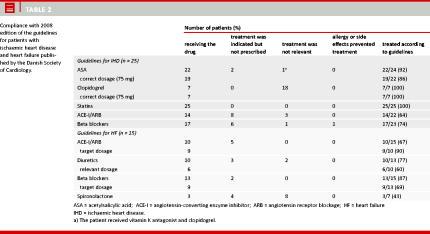 Accordance with guidelines: Patients were categor-ized according to their referral diagnosis, and medicine charts were subsequently compared with the Danish guidelines (2008 edition) for treatment of IHD or HF (Table 1) [11]. The medicine charts of the IHD patients who had concurrent symptoms of HF, NYHA (2-4), were compared with both guidelines. Non-pharmacological treatment was not assessed. The Danish guidelines are compiled by the DSC and are considered the gold standard for treatment. Undertreatment was defined as the absence of a recommended drug and a daily dosage lower than recommended target dosages.