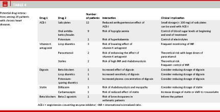 Potential drug interactions: Table 4 summarises the 35 potential drug interactions identified in 19 patients. Nine patients had no potential drug interactions. The drugs most commonly involved in potential interactions were ACE-I, vitamin K antagonist, digoxin and statins. None of the interactions were potentially harmful.