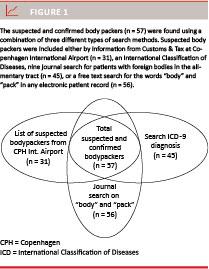 Data for all suspected and confirmed body packers were collected retrospectively from a two-year period (1 March 2011 to 28 February 2013). Patients were admitted to the Department of Surgical Gastroenterology, Hvidovre Hospital (Denmark). To identify all patients, a list of suspected body packers was retrieved from the Department of Customs & Tax at Copenhagen International Airport. Furthermore, identification was made by a journal search on International Classification of Diseases (ICD) 10-codes in which discharge papers referred to patients admitted with foreign bodies in their gastrointestinal tract. Also, a free text search of the terms “body” + “pack” contained within any electronic patient record in the study period was performed (Figure 1). All patient files were reviewed, and we included both suspected and confirmed body packers in the study. Individuals suspected of body packing were all detained at Copenhagen International Airport. They were guarded by the police and admitted to the hospital until the suspicion of body packing was clarified.