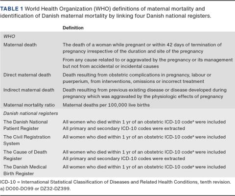 Various studies have indicated that underreporting of maternal deaths also occurs in countries with well-established national registers [1-3]. As a result, in 2002, the Danish Society of Obstetrics and Gynaecology (DSOG) formed a national maternal mortality audit group to identify and classify maternal deaths, and to audit each case to identify suboptimal care, learning points and areas needing future clinical guidelines [4].