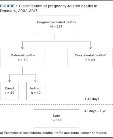 INTRODUCTION. Although women rarely die during pregnancy and childbirth in Denmark, keeping track of the maternal mortality rate and causes of death is vital in identifying learning points for future management of critical illness among obstetric patients and in pinpointing risk factors.