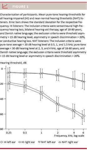 A total of 29 HI listeners (aged 52-80 years, mean age 68.4 years, 13 females, eight new and 21 experienced HA users) and 26 listeners with near-normal hearing thresholds (NHT listeners; aged 41-70 years, mean age 55.8 years, 18 females) participated. The term “near-normal” reflects the fact that thresholds were elevated in some listeners at high frequencies. The NHT group was included to obtain profile outcomes for a population in a similar age range but without hearing-sensitivity difficulties, and to observe the extent of individual differences within this group. Figure 1 shows mean audiograms for the two groups.