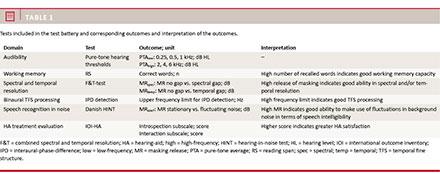 Although audibility may be restored by a HA, users often complain about communicating in the presence of background noise. The audiogram has been found to correlate well with speech intelligibility in quiet, but to correlate poorly in noisy contexts [2, 3]. Moreover, hearing-impaired (HI) listeners with normal or near-normal low-frequency pure-tone hearing thresholds may show speech identification deficits when the speech spectrum is limited to regions of normal or near-normal hearing [4]. Speech intelligibility in noise has also been found to correlate with temporal fine-structure (TFS) processing abilities reflected by, e.g., frequency discrimination [2, 5]; and TFS processing deficits can be present despite near-normal thresholds [6]. The evaluation of a test battery including different hearing domains has also shown that HI listeners can suffer from auditory deficits that do not necessarily correlate with the audiogram [7].