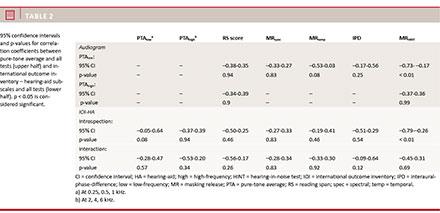 Table 2 (upper rows) lists the correlation coefficient CIs between measures from each test and the PTA at high and low frequencies. Only MRHINT was significantly correlated to low-frequency PTA. Outcomes from the RS, F&T and IPD detection tests were not correlated with audibility.