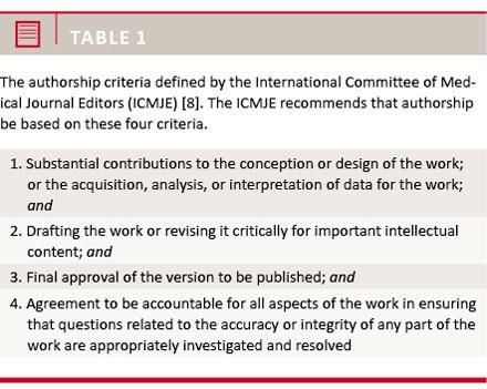 Authorship definitions and traditions are different in biomedicine compared with other scientific fields and disciplines [4]. In general, a tendency towards a growing number of authors per article is seen, but averages vary across disciplines [4-6]. In the humanities, articles have relatively few authors, whereas articles in e.g. high-energy physics can have hundreds or even thousands of authors [7]. The definition of authorship and the use of authorship criteria also differ. In biomedicine, the majority of journals have implemented the authorship criteria defined by the International Committee of Medical Journal Editors (ICMJE) [8] (Table 1). These criteria have