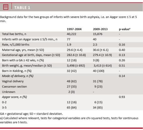 Methods: A cohort study comparing morbidity and mortality for term-born infants born with severe birth asphyxia, defined as an Apgar score ≤ 5 at 5 min., before and after major changes in the organisation of births in a Danish district.