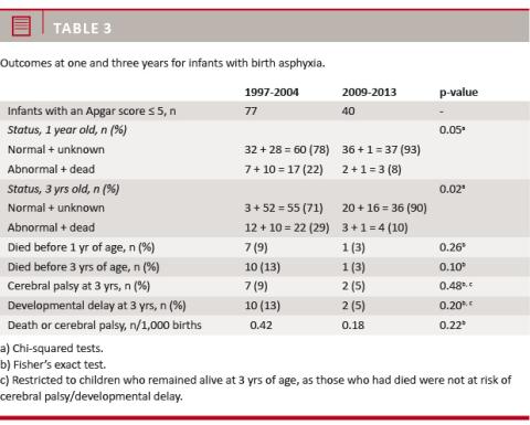 Results: The study included 77 infants born in 1997-2004 and 40 infants born in 2009-2013 who were admitted to a neonatal intensive care unit with an Apgar score ≤ 5 at 5 min. The rate of severe birth asphyxia was 1.9 per 1,000 births in the early years and 2.5 per 1,000 births for the 2009-2013 period (p = 0.16). Mortality in the first three years of life with severe birth asphyxia was 0.24 per 1,000 births in 1997-2004 (ten deaths) and 0.06 per 1,000 births in 2009-2013 (one death) (p = 0.20). We observed a highly significant difference between the two periods in the proportion of infants with neonatal seizures and age at discharge after birth. The outcome of death or cerebral palsy was present in 17/77 (22%) in the early period and 3/40 (7.5%) in the more recent period (p < 0.05).
