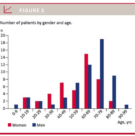 The group of responders consisted of 46 women and 58 men. Patient ages ranged 6-93 years (mean: 60 years, median: 68 years), see Figure 2. Seven patients were under 18 years of age. A total of seven patients were mentally retarded; two of these reported that they had received help filling out the questionnaire from either a family member or an assistant. The follow-up