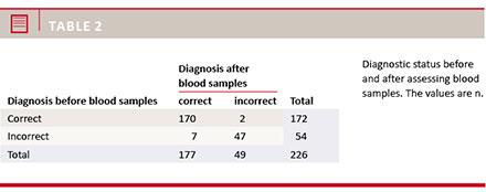 results from the blood samples showed no significant changes. Based on clinical findings alone, 76.1% (95% CI: 70.0-81.5) of the diagnoses were correct, and this was only marginally improved to 78.3% (95% CI: 72.4-83.5) after taking into consideration the results of the blood samples (p = 0.1797). Table 2 summarises the diagnostic status before and after assessing the blood samples. The table shows that 4.0% (95% CI: 1.8-7.4, n = 9) of the diagnoses were changed after assessing the blood results and 77.7% (95% CI: 40.0-97.2, n = 7) of these were changed from incorrect to correct diagnoses.