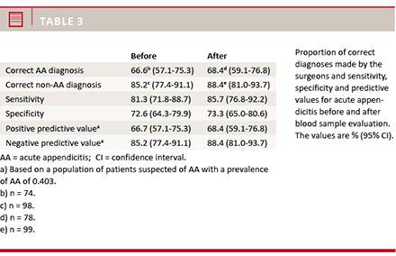 diagnosing AA. Only a small proportion (4.0%) of the diagnoses was changed after assessment of the blood results, which shows that the surgeons rely strongly on the physical examination and the patient’s history. We observed no significant change in the proportion of correct diagnoses from before to after, as well as no change in the sensitivity, specificity and predictive values of the surgeons’ diagnoses. This indicates that the blood samples did not contribute with additional diagnostic information. However, on the other hand, they also had no negative influence on the decision concerning surgery for suspected acute appendicitis.