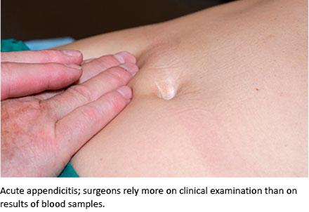 diagnosed with AA compared to the non-included patients. This may be explained by less severe symptoms among non-included patients. This was not registered and is a possible confounder. Therefore, the present results have to be interpreted with this in mind. Apart from this, the two groups of patients were similar. In the group of patient included as “no change” without blood sample evaluation, 47 out of 48 patients underwent surgery as planned. We therefore assume that blood samples would not have altered the clinical decision. A limitation of the present study design is that it was not possible to fully control whether the surgeons performed the physical examination before assessing the blood samples. A randomised design or controlling the viewing of the blood samples would have strengthened the results, but this was not possible due to ethical and logistic considerations. As described in the Method section, several precautions were taken to ensure that protocol was followed, and we found no indications of protocol violation. Another unknown factor was that the time between the physical examination and assessment of the blood results varied between cases; this could have been a confounder as the surgeon might gain information from a prolonged observation time. We have no information on the influence of the specific results of the blood samples on differential diagnoses.
