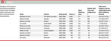 We found a cancer incidence rate of 18.5 per 1,000 person-years in our cohort of patients receiving their first kidney allograft during 1997-2000. In 2007, the prevalence of any cancer was 0.13 (0.06-0.21). Table 1 presents the findings of previously published studies for comparison.