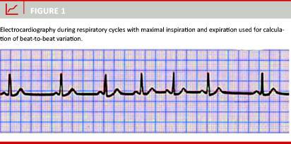ECG was recorded with the patient in the supine position during five respiratory cycles of each five seconds with maximum inspiration and expiration [9]. This respiration rate is reported to give the greatest effect of beat-to-beat variation [10]. For each respiratory cycle, the shortest and the longest RR interval was measured in every derivation on the ECG and the difference was then calculated and converted into beats/min. [9] (Figure 1).