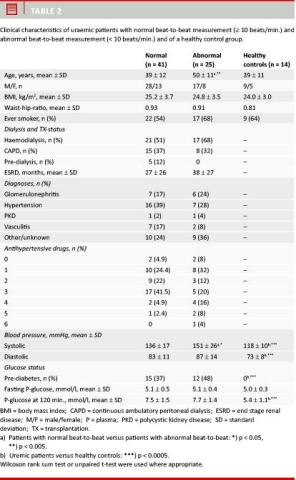 Uraemic patients with abnormal beat-to-beat variation were significantly older (p < 0.005), had a higher systolic blood pressure (p < 0.05) and showed a tendency towards longer duration of uraemia than uraemic patients with a normal beat-to-beat variation (Table 2). Smoking habits, renal diagnosis, medication use and duration of dialysis treatment were comparable in uraemic patients with and without abnormal beat-to-beat variability (Table 2).