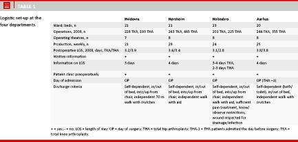 Introduction: Introduction: The goal of this study was to describe the logistic and clinical set-up at four Danish arthroplasty departments offering fast-track surgery.