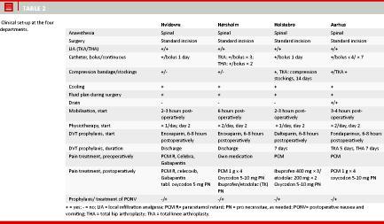 Minor differences were seen between the departments with regard to clinical features. Variation was observed in the use of drains at one department, ketorolac in the local infiltration analgesia (LIA) mixture at two departments, and the use of a variable number of boluses in the catheter with the LIA technique across departments. The department using the most boluses did not use NSAIDs for postoperative pain treatment – future studies will reveal if any of these differences are of significance to patients’ satisfaction with pain treatment or with the entire stay – as LOS seemed to be unaffected.