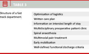 Fast-track surgery is defined as the synergistic, beneficent effect on convalescence achieved by adding multi-modal evidence-based care principles and combining these with optimised logistics [1]. Fast-track surgery has yielded quicker functional recovery, reduced morbidity, decreased length of convalescence, increased satisfaction and – as a secondary gain – reduced hospital costs. These results have also been achieved in total hip arthro- plasty (THA) and total knee arthroplasty (TKA) [2, 3].