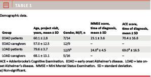 All patients had sporadic AD, except for one EOAD patient with a known PSEN1 mutation. The mean age, MMSE scores, mean duration of the follow-up period and gender distribution for both patients and caregivers are provided in Table 1.