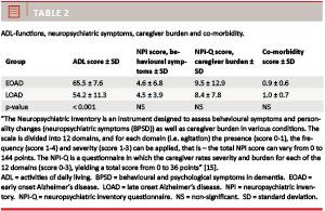 The lower ADL score we recorded in the LOAD was expected due to normal aging not directly related to AD. Taking into account all relevant co-morbidity, we saw no significantly higher degree of co-morbidity in the LOAD group. The presence and severity of neuropsychiatric symptoms was on average lower than reported in most previous studies of AD, regardless of the age group. We have no obvious explanation for this finding.