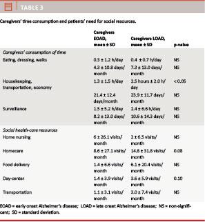Compared with the EOAD group, caregivers in the LOAD group consumed more time helping patients at home with the following daily tasks eating, getting dressed, taking walks, housekeeping, economy and surveillance (Table 3), but this trend was only significant when measuring the single parameters.