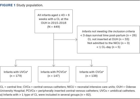This retrospective study was conducted in a level lll NICU at Hans Christian Andersen Children’s Hospital, Odense University Hospital (OUH), Denmark. In the period from November 2019 to February 2020, we collected data from patient medical records using procedural registrations for UVCs, PCVCs and CVCs. Furthermore, we collected data on the World Health Organization (WHO) International Classification of Diseases, tenth version (ICD-10) codes for prematurity, extremely low birth weight, CLABSI, septicaemia, hypoglycaemia and asphyxia, as well as procedural registrations for treatment with ventilator or continuous positive airway pressure and parenteral nutrition. The inclusion criteria were: 1) postmenstrual age < 44 weeks, 2) survival to at least the third day, 3) admission to the NICU and 4) CL insertion at the OUH within the period from 1 January 2015 to 31 December 2018. We used the Centre for Disease Control and Prevention’s definition of clinical sepsis in infants ≤ 1 year of age [13] supplemented with the criterion: ≥ 7 consecutive days of antibiotic treatment [14]. Thus, a CLABSI event was defined as: