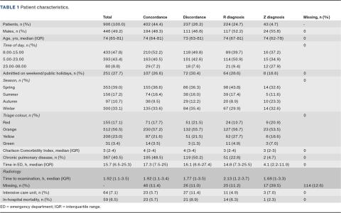 Among 1,804 ED patients with dyspnoea, 906 were admitted, 402 were concordant and 237 were discordant. Furthermore, 224 with an R and 43 with a Z diagnosis were excluded from the outcome analyses. Among the 639 concordant or discordant contacts, 563 were unique patients of whom 39 died in the hospital. Thus, the outcome analyses included a total of 524 patients. In terms of characteristics, it was found that discordant patients were more frequently admitted on weekends or public holidays, were more frequently triaged red and had higher admissions rates to the intensive care unit than concordant patients. There was no difference in age, sex or comorbidity between discordant and concordant patients (see Table 1).