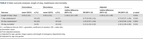 RESULTS. Concordant contacts had an average LOS of 3.63 days, whereas discordant contacts had an average LOS of 4.65 days; the adjusted relative difference was 1.28 (95% CI: 1.10-1.48). Readmission, whether at seven or 30 days, was not significantly different between the groups. The 30-day mortality was 5% in the concordant and 10% in the discordant group, with an adjusted OR of 2.32 (95% CI: 1.08-4.96).
