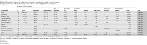 We found a concordance rate of 67% among patients with pneumonia or COPD as the ED diagnosis, and 88% among those with HF. Similarly, Chandra et al. found a 73% concordance rate in patients initially diagnosed with community-acquired pneumonia in the ED [9]. Hunold et al. investigated changes in diagnoses in dyspnoeic patients admitted with pneumonia, COPD or HF and found concordance rates of 47%, 56% and 54%, respectively, for these diagnoses [10].