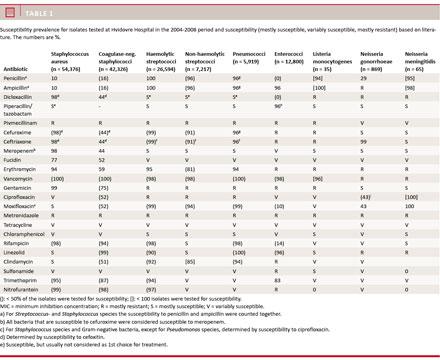 strictly reporting susceptible isolates from a large study material and combining these data with data obtained from the literature for rarer cases, this table does provide the clinician with a useful tool for clinical practice based on clinical research.