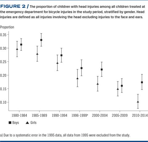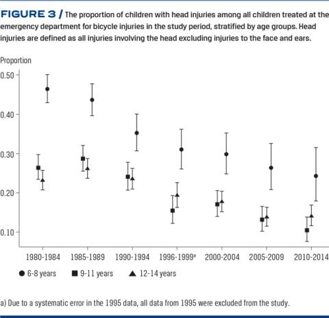 We included 13,294 children, 58.7% were boys. From 1980-1984 to 2010-2014, the use of helmets increased from 0% to 49.9% in boys and from 0% to 57.1% in girls. The proportion of boys and girls with head injuries decreased from 31.3% to 17.4% and from 29.6% to 10.1%, respectively. A similar reduction was found in the proportion of children with severe head injuries. In the study period, the proportion of children with facial injuries, fractures, spinal injuries and internal injuries in trunk remained unchanged. Eighteen children died from their injuries, none of whom wore a helmet.