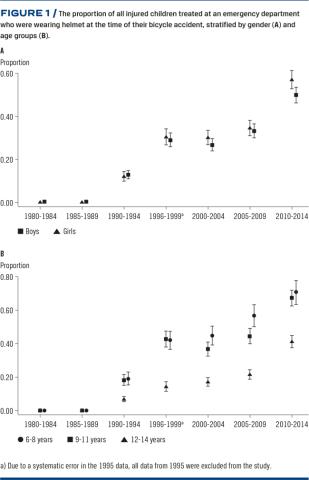 A total of 1,067 (19.4%) girls and 1,288 (16.5%) boys wore a bicycle helmet at the time of their accident. From 1980-1984 to 2010-2014, this proportion increased from 0% to 57.1% (95% confidence interval (CI): 52.8-61.3%) among girls and from 0% to 49.9% (95% CI: 46.3-53.6%) among boys (Figure 1). From 1980-1984 to 2010-2014, the proportions increased from 0% to 70.9% (95% CI: 63.3-77.7%), 67.3% (95% CI: 62.5-72.0%) and 41.1% (95% CI: 37.5-44.8%) in the age groups 6-8, 9-11, and 12-14 years, respectively (Figure 1).