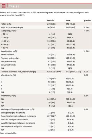 We found no difference between females and males concerning CMM thickness (p = 0.07), Clark level (p = 0.23), ulceration (p = 0.17) or melanoma type (p = 0.88).