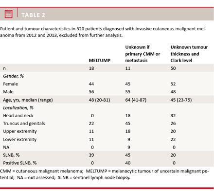 A total of 848 cases (tumours) of CMM were identified in the DMR according to the inclusion criteria. After reviewing the extracted data, 76 cases were excluded due to incomplete registration (12 patients), incorrect year of diagnosis (42 patients), unknown biopsy date (eight patients), duplicates (13 patients) or not melanocytic tumour (one patient). A total of 29 patients were diagnosed with more than one CMM during the observation period from 2012 and 2013 (29 patients had 63 CMM tumours in total). Only the first CMM was used in the following comparative analysis. A total of 520 patients with invasive CMM (Clark level 2-5) were identified and are described further in this study (Table 1). Patients with MELTUMP (18 patients), unknown if primary CMM or metastasis (11 patients), unknown thickness and Clark level due to limitations in biopsy material (50 patients) are presented in Table 2 only with descriptive data