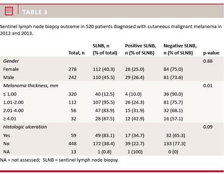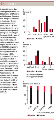 Results: We identified 520 patients with invasive cutaneous malignant melanoma. More females than males suffered from cutaneous malignant melanoma. Furthermore, females were younger than males, and the anatomical distribution of malignant melanoma varied between the genders. Outcome of sentinel lymph node biopsy was associated with tumour thickness.