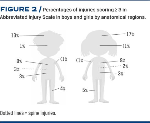 More than half of all our children had head injuries, and one in eight boys and one in six girls had head injuries categorised as serious or worse. With the exception of head injuries, the anatomical location of serious injuries was similar for boys and girls. Similar to our findings, Buschmann et al showed a dominance of head injuries [5]. The high incidence of head and thoracic injuries can be explained by child anatomy with a large head and trunk compared with the rest of the body. At birth, the head size accounts for a fourth of the total body length, and in adults only a seventh [14]. The large head, a higher centre of gravity, a thinner cranial bone to give protection and less myelinated neural structure altogether increase the risk of brain damage in children [15]. Children’s neck ligaments and spine musculature are also weaker than those of adults; and together with the large head, this contributes to a high risk of serious cervical spine injuries [14].