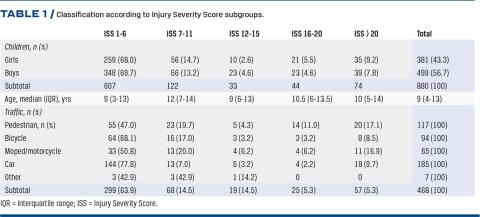 Results: A total of 880 children (499 boys and 391 girls) were included. No significant sex-related differences were observed in the numbers admitted during the study period, age at admission or severity of injuries. Overall, 30% of the paediatric patients were admitted in the afternoon (3-6 p.m.). The crude death rate was 2.7% of all admissions. Traffic accidents accounted for 48% of all admissions and two-thirds of all deaths. All non-survivors received ISSs of 16 or higher, and 20% of deaths in this group and 42% of overall deaths occurred within the first 24 hours.