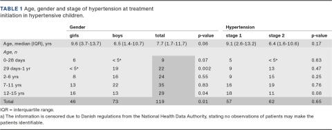 METHODS: Our review of the medical records of children under 16 years living in Central and Eastern Denmark from April 2014 to May 2015 found that 119 children were registered with an International Classification of Diseases, tenth edition diagnosis of hypertension and treated with antihypertensive medicine.