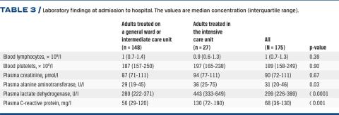 By 20 April, 23 of 175 (13.1%) patients remained hospitalised, 43 (24.6%) had died and 109 (62.3%) had been discharged from hospital (Figure 1). The median follow-up time to one of these outcomes was four (1-9) days. Among 27 patients requiring mechanical ventilation, 17 had died (59.3%), eight remained in intensive care (29.6%) and three had been discharged (11.1%).