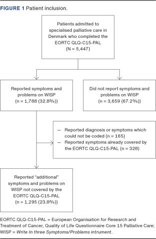 In 2016, 5,447 patients with advanced cancer were admitted to SPC and completed the EORTC QLQ-C15-PAL of whom 1,788 patients reported at least one symptom/problem using the WISP instrument [6]. Among these, 1,295 patients reported additional S/Ps not covered by the EORTC QLQ-C15-PAL (Figure 1).