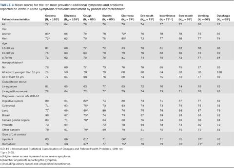 The distributions of mean scores differed significantly according to sex, diagnosis and type of first contact. Women presented more severe oedema (p = 0.002) and less severe diarrhoea (p = 0.037) than men. The largest differences between cancer diagnosis groups were seen for cough, where patients with cancer in the digestive system presented more severe cough than patients with other cancer diagnoses (p = 0.043). Inpatients reported more severe cough (p = 0.020), diarrhoea (p = 0.047) and vomiting (p = 0.013) than outpatients.