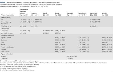 Multiple logistic regression analyses of the reporting of the ten most prevalent additional S/Ps are shown in Table 2. Patients with younger children had a higher probability of reporting oedema and sore mouth than patients with older children. Patients living with someone had a higher probability of reporting cough and sweats than patients living alone. Diagnosis was significantly associated with the probability of reporting certain S/Ps: patients with prostate cancer had the highest odds of reporting sweats, patients with colorectal and prostate cancer were more likely to report incontinence, and the highest odds of reporting vomiting was seen among patients with cancer in the female genital organs and in the digestive system. Outpatients had higher odds of reporting dry mouth than inpatients. None of the variables were related to the reporting of dizziness, diarrhoea or dysphagia. Sex and age were not significantly associated with any of the outcomes.