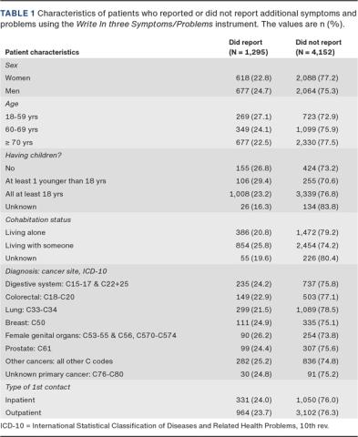 ResultsIn total, 1,295 patients reported additional S/Ps on WISP. Reporting any additional symptom/problem was associated with having younger children and living with someone. The reporting of the most prevalent additional S/Ps was associated with cancer diagnosis, having younger children, living with someone and being an outpatient.