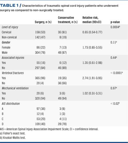 RESULTS:A total of 584 (women = 122; men = 462) traumatic patients with SCI with a median age of 42.9 years (26.4-58.3 years) were identified of whom 390 underwent surgery (SG) and 55 were treated conservatively forming a conservative group (CG). The acute treatment regime was unknown in 139 patients with SCI. Patients in the CG were significantly older (median 63.6 years (IQR: 39.1-71.5) than patients in the SG (median 52.8 years (IQR: 37.2-67.2), p = 0.02). The relative risk (RR) of fractures was higher in the SG (RR = 2.74 (1.91-3.95), p < 0.0001). The initial American Spinal Injury Association Impairment Scale (AIS) grades (A, B, C and D) differed significantly (Kruskal-Wallis test, p < 0.02) with a higher frequency of AIS Din the CG. Fewer persons with a cervical than with a non-cervical level of injury underwent spinal surgery (RR = 0.65 (0.54-0.77), p < 0.0004).