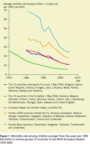 The European Region of WHO has 53 Member States, including all 27 European Union (EU) countries and countries in central and eastern Europe and central Asia. The health status of children and adolescents in the European Region has generally improved in recent decades. Child mortality has been declining gradually in nearly all countries at different rates and especially fluctuated at the time the USSR was dissolved ( Figure 1 ).
